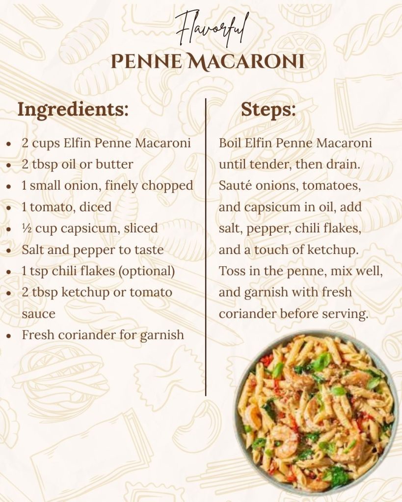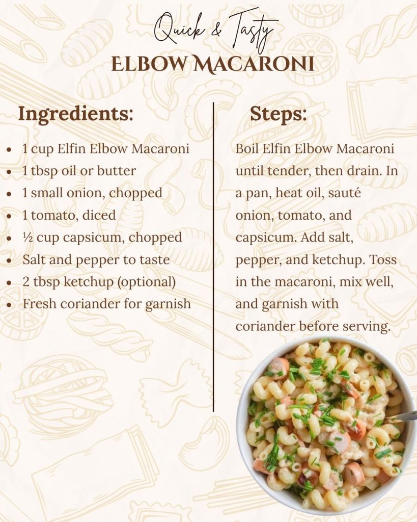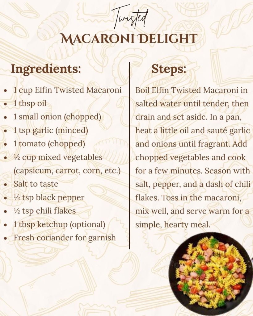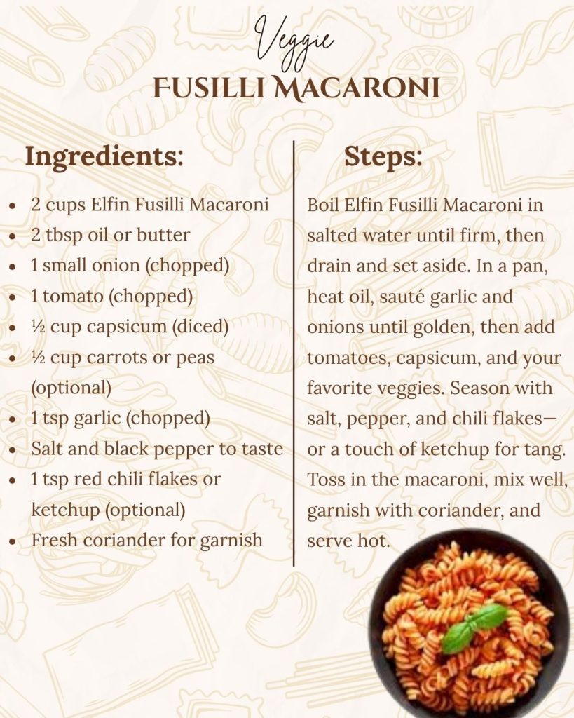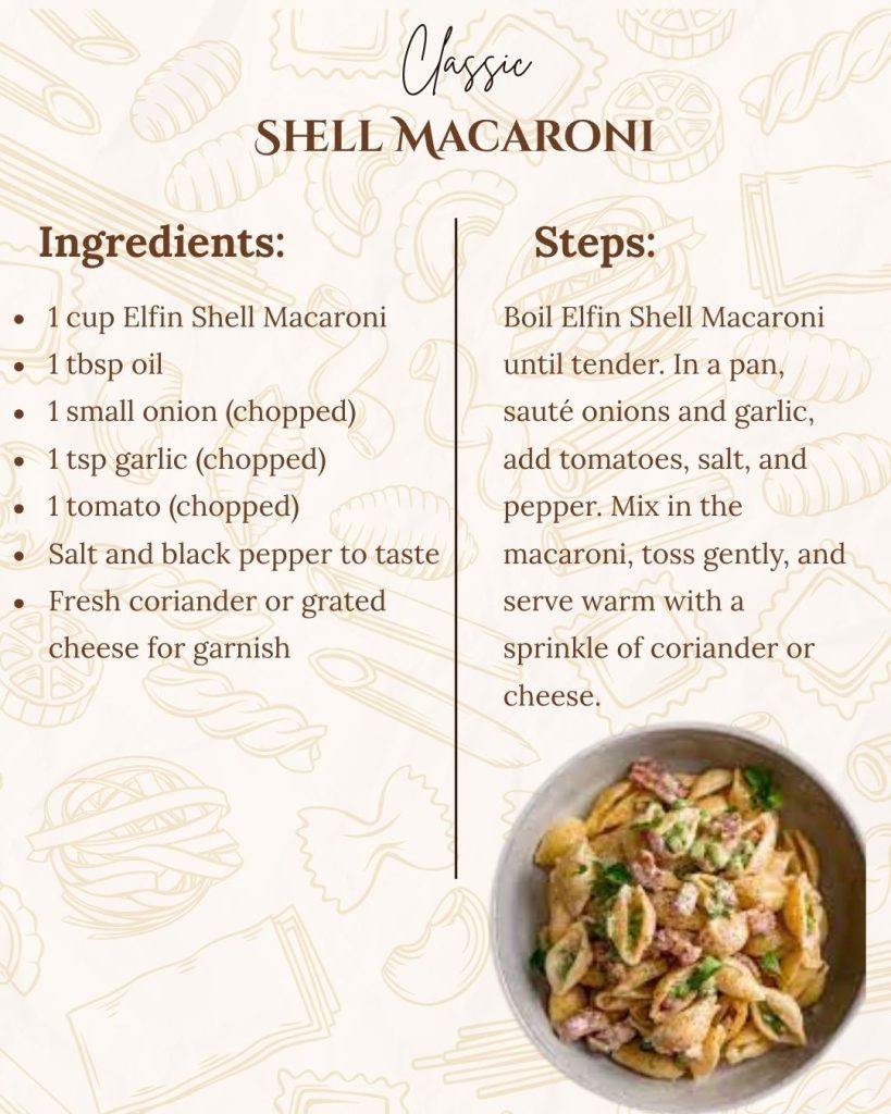 Elfin Product Recipes Elfin recipes, we help you turn simple ingredients into meals that bring comfort, joy, and togetherness, no matter the occasion. Our Dish Fusilli Macaroni Spirals that soak up every bit of flavor. Twisted Macaroni A playful twist on tradition. Penne Macaroni Great for both simple meals and indulgent recipes. Shell Macaroni Spirals that soak up every bit of flavor. Cut Vermicelli Comfort food made simple. Elbow Macaroni Comfort food made simple.